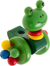 La grenouille a deux grandes roues avec des perles colorées qui cliquettent lors du mouvement, rendant le jeu encore plus amusant. Le jouet est soigneusement travaillé avec des bords lisses qui éliminent le risque de blessure par écharde.