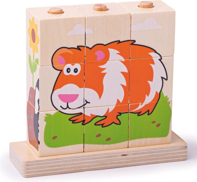 Le set comprend au total 10 pièces – 9 cubes qui composent 4 images différentes, et une base en bois avec tiges pour un empilage sûr et ordonné. Le jouet est fabriqué en bois durable à surface lisse et répond aux normes européennes de sécurité actuelles.