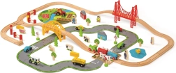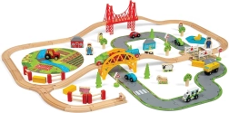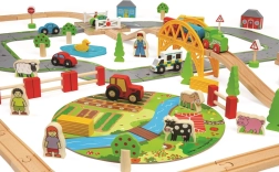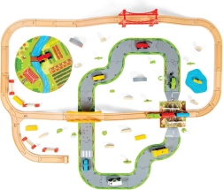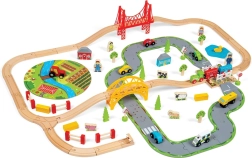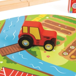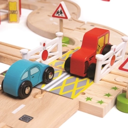 circuit de voitures de la marque Bigjigs Rail, qui combine le charme du rail et des routes dans un environnement rural.