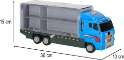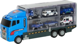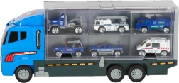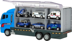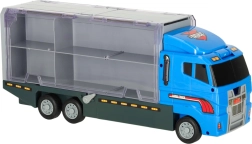 Le grand camion bleu combine la fonction de stockage avec la possibilité de jouer. Permet de transporter jusqu'à 14 petites voitures métalliques, qui font partie du pack. Les petites voitures imitent de manière réaliste les véritables voitures de police et d'urgence. Le camion a deux côtés avec des portes transparentes et des verrous de sécurité, garantissant que les voitures ne tombent pas pendant le transport. Contient également un lanceur de petites voitures à l'avant, ajoutant une autre dimension au jeu.