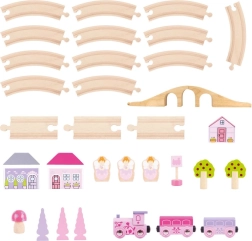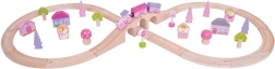 Le circuit de train comprend des décorations féeriques telles que des arbres et des personnages, permettant aux enfants de plonger dans un monde d'imagination.
