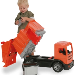 Ce grand camion-benne orange, inspiré du véritable modèle MERCEDES ACTROS, apporte des expériences authentiques dans la chambre des enfants. Deux mécanismes de levage indépendants et les bacs fournis permettent d’imiter la véritable collecte et le vidage des déchets. La conception durable en plastique haut de gamme répond aux normes européennes et supporte une utilisation intensive.