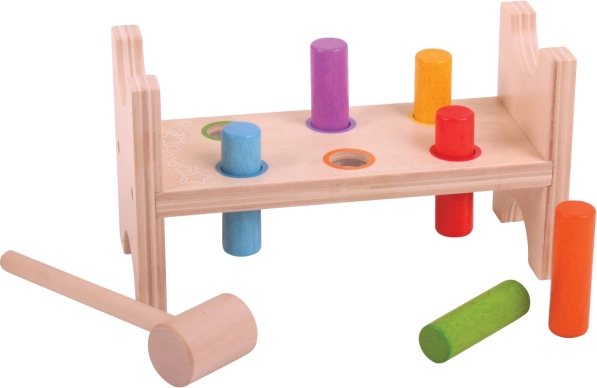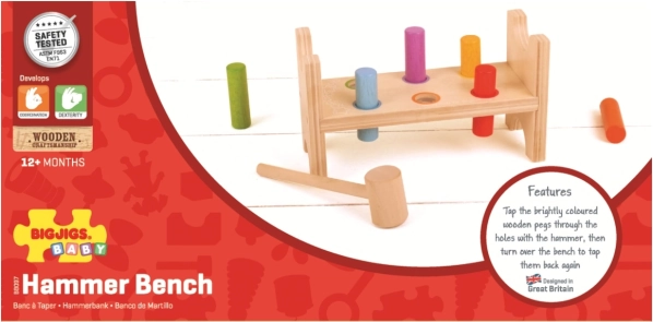 Ce marteau en bois classique de la marque Bigjigs Baby séduit les enfants par son principe simple : les chevilles sont enfoncées dans les trous avec le maillet, puis il suffit de retourner le banc pour recommencer le jeu. Les couleurs vives stimulent la perception et soutiennent la concentration.