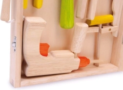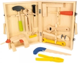 Superbe mallette en bois avec outils pour tous les jeunes bricoleurs qui souhaitent développer leurs compétences manuelles. Elle contient un marteau, une pince, une perceuse et des clés pour écrous, le tout fabriqué avec des matériaux de qualité.