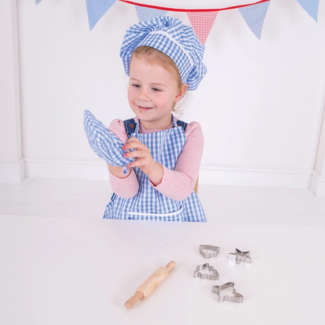 Les jeunes chefs adoreront cet ensemble en coton bleu lumineux et attrayant pour la cuisson et la cuisine. Il comprend un tablier, une manique, une toque de chef, un rouleau à pâtisserie et des emporte-pièces, idéal pour des activités culinaires amusantes et des jeux de rôle.