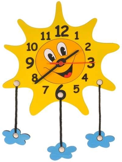 Horloge en bois Soleil est une horloge peinte à la main destinée à être accrochée au mur, qui aide les enfants à développer leur sens du temps de manière ludique.