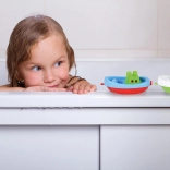 Trois bateaux colorés qui flottent et peuvent être utilisés dans la baignoire, la petite piscine ou sur la terre ferme. Leur forme simple et leurs couleurs vives invitent au jeu.
