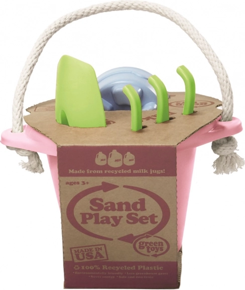 Green Toys propose des jouets responsables en plastique 100 % recyclé, sans PVC, bisphénol ni phtalates. Ce set de sable rose contient :