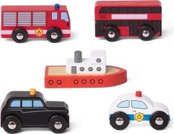 - 5 pièces dans la boîte : camion de pompiers, voiture de police, autobus à impériale, taxi, bateau.