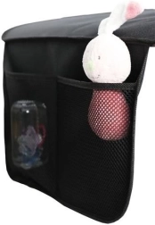 Le tapis s'attache facilement grâce à des sangles élastiques qui se fixent à l'appui-tête. Il comprend également deux poches en filet qui facilitent le rangement de petits objets comme des jouets ou des bouteilles. Ces poches sont pratiques et permettent un accès rapide aux objets stockés.