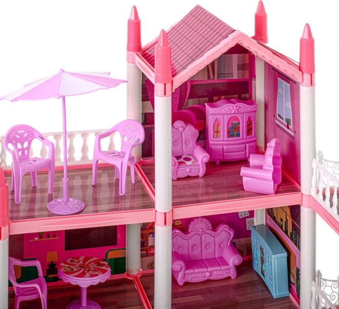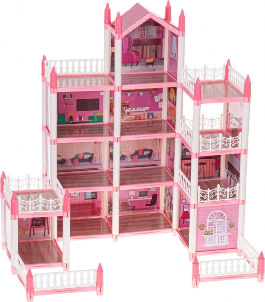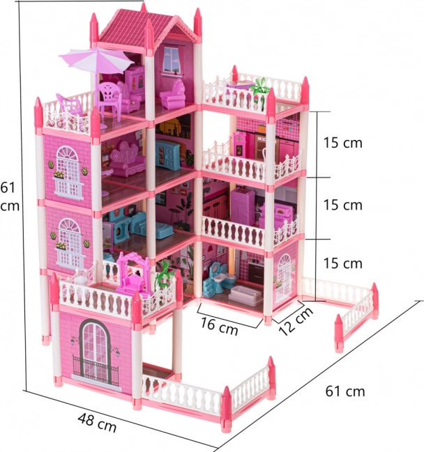 La villa rose pour poupées possède quatre étages, offrant des pièces fascinantes et variées à explorer.