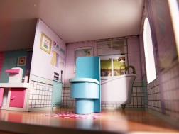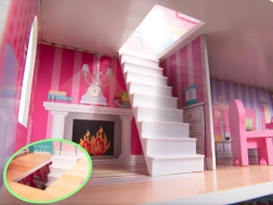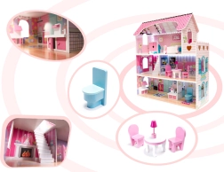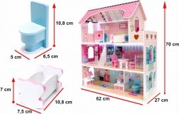 La maison propose trois niveaux avec cinq pièces, escaliers et petits balcons. Les impressions colorées sur les murs et les sols créent une atmosphère chaleureuse propice au jeu imaginatif.