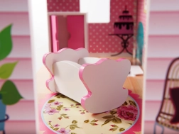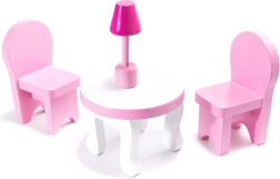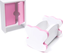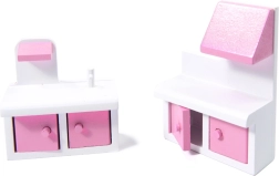 Inclus, 9 pièces de mobilier : armoire, berceau, lampe, 2 chaises, table, cuisine avec hotte, meuble avec évier et toilettes – prêt pour jouer immédiatement.