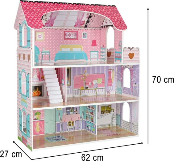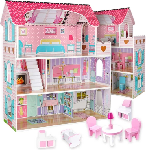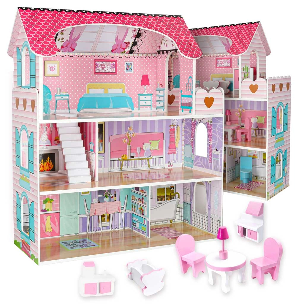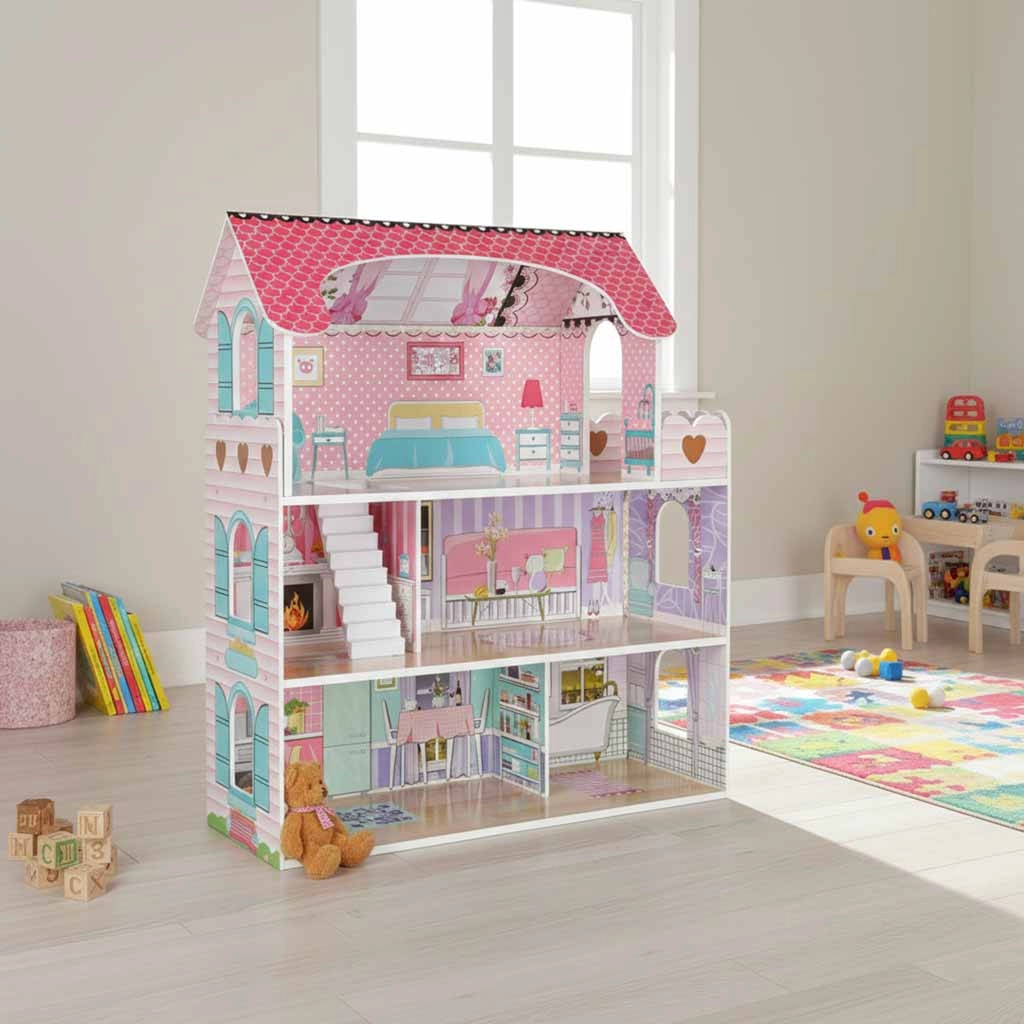 La grande maison de poupées en bois ravira enfants et parents. Trois étages spacieux abritent une cuisine, une salle de bain, une chambre, un salon et un escalier avec balcon. L’ensemble riche d’accessoires en bois et les impressions murales réalistes favorisent le jeu de rôle créatif et le développement de la motricité fine.