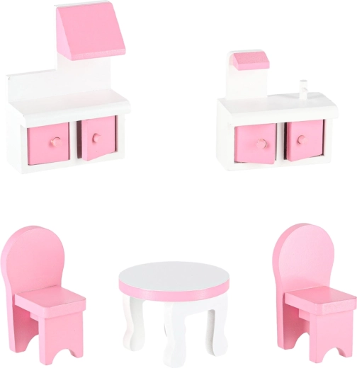 Comprend des armoires avec portes ouvrantes, une kitchenette, une table et des chaises, un berceau, une lampe et des toilettes – le tout en bois finement travaillé avec de délicats détails.