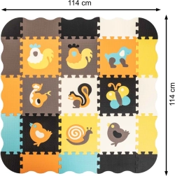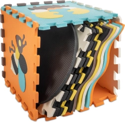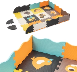 Ce grand tapis en mousse est composé de 25 éléments (9 pièces principales avec animaux amovibles et 16 cadres de bord). Grâce à sa structure de surface plus marquée et à ses couleurs contrastées, il stimule naturellement la vue et le toucher. La mousse EVA souple amortit les chutes lors des premiers pas et protège du froid du sol.