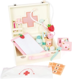 Cette mallette de docteur en bois de qualité Small Foot Isabel est idéale pour les jeux de rôle. Le set comprend 24 accessoires, dont un bandeau textile avec croix rouge et des instruments médicaux colorés au motif fraise, pour ravir chaque enfant.