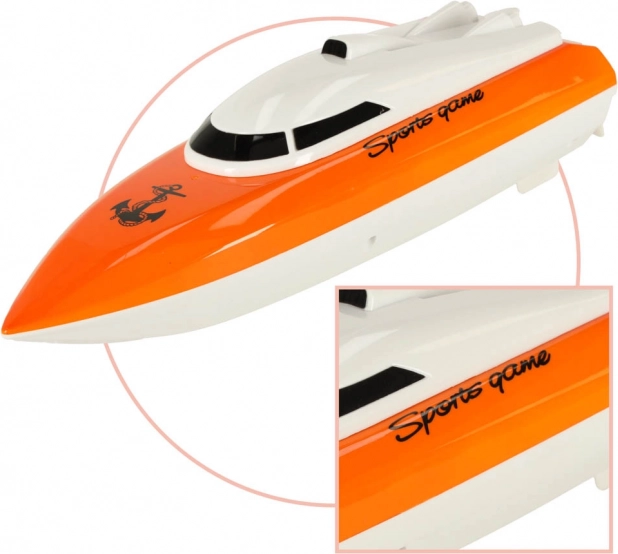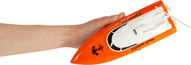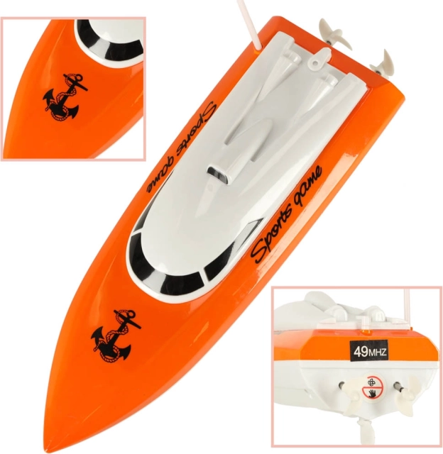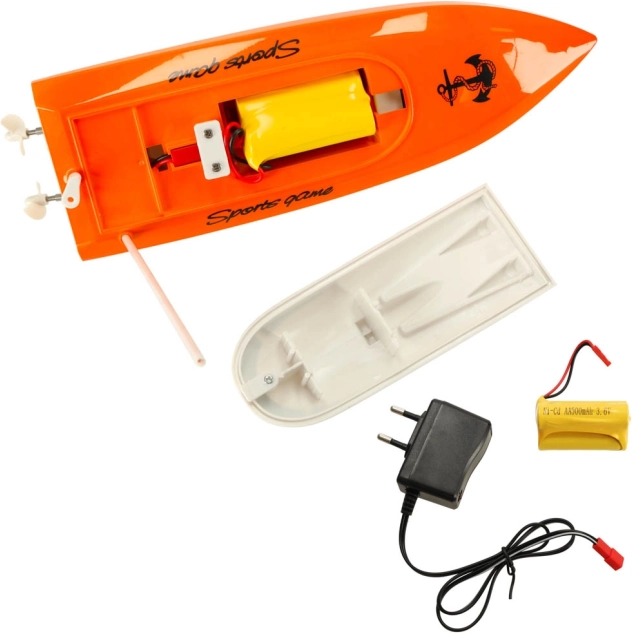 Le modèle est alimenté par une batterie Ni-Cd 3,6 V 500 mAh rechargeable avec le chargeur secteur fourni. La télécommande fonctionne sur les fréquences 49/40/27 MHz et offre une portée jusqu’à 20 m. Tout le nécessaire est inclus – il suffit d’insérer 2× piles AA dans la télécommande pour partir sur l’eau.