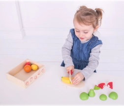 Ce coffret soigneusement réalisé comprend des fruits appréciés — pomme, poire, orange, citron, fraise, banane et pastèque — ainsi qu’un couteau en bois et une planche. Chaque fruit est segmenté en morceaux que vous pouvez « découper » en toute sécurité puis assembler à nouveau. Le bois de qualité, les bords lisses et la fabrication robuste garantissent un jeu confortable et sûr.