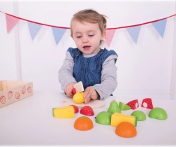 En « découplant » les fruits en bois avec un couteau sûr, les enfants entraînent la prise en main, la coordination œil–main et la précision des gestes.
