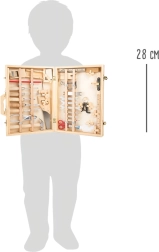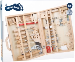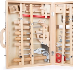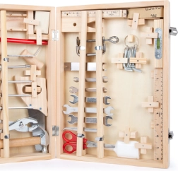 Set complet pour petits bricoleurs dans une élégante mallette en bois. Contient 48 pièces d’outils en bois et en métal comme des clés, tournevis, scie ou marteau. Chaque pièce a sa place et est sécurisée par des verrous de sécurité pour un rangement clair et sûr.