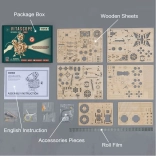 Le kit comprend tout le nécessaire : pièces prédécoupées en contreplaqué, axes en acier, diode, bande de film et manual illustré avec QR code vers la vidéo de montage. Le modèle est un excellent cadeau et en même temps une décoration design pour le bureau ou le salon.
