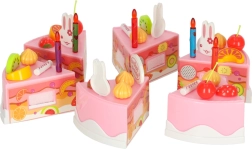 Le gâteau se compose de 6 parts reliées par des bandes auto-agrippantes. Les enfants peuvent le « découper » en toute sécurité avec un couteau en plastique et le servir dans des assiettes.