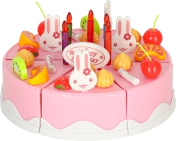 - 6 parts de gâteau, 5× bougie, 14× meringue, 7× bâtonnet sucré, 4× cerise, 4× mandarine, 3× fraise, 3× kiwi, 4× petit lapin, pancarte « Happy Birthday », 3× assiette, 3× biscuit, 3× tranche de roulé, tasse, cuillère, fourchette, petit couteau, pelle à gâteau, coupe à glace, autocollants, set de bandes auto-agrippantes