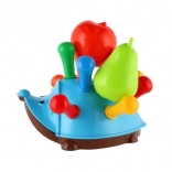Ce jouet est équipé de dix trous sur le dos du hérisson où les enfants peuvent insérer des "piquants" colorés. L'ensemble comprend également une pomme et une poire qui peuvent être placées parmi les piquants pour offrir d'autres variations de jeu. Pour encore plus de plaisir, le hérisson est doté de quatre roues manœuvrables et d'un trou pour attacher une corde, ce qui en fait également un jouet à tirer.