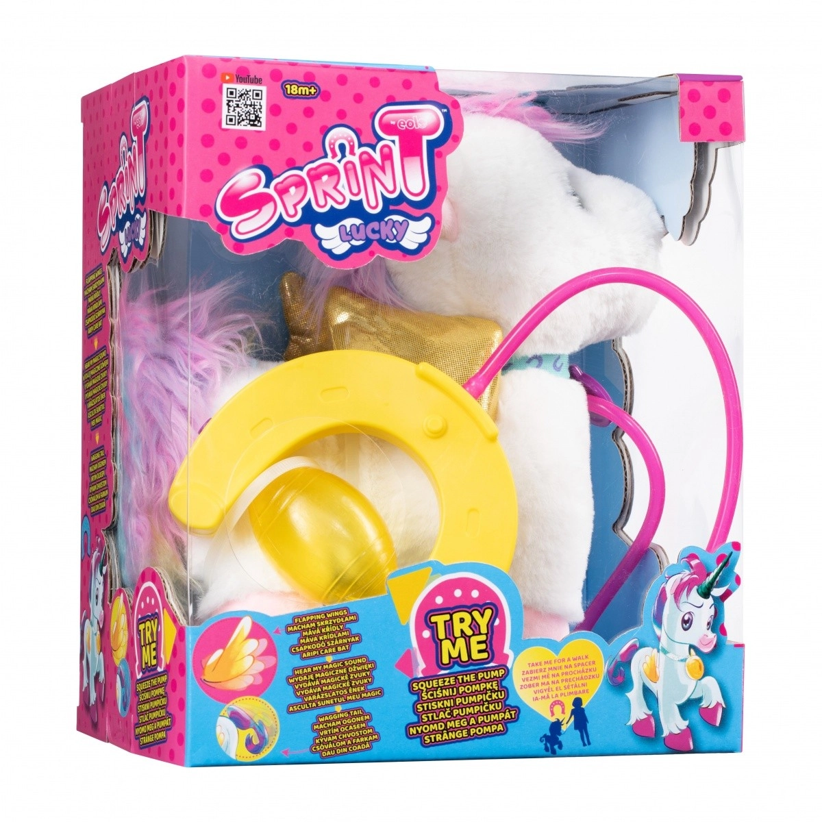 La mignonne licorne interactive Lucky ravira chaque enfant – il suffit de prendre la laisse et la peluche vous suivra. Elle possède des petites pattes stables avec des billes spéciales pour rester bien droite, même lorsque de plus jeunes enfants jouent avec. Une pompe à air intégrée dans la laisse gonfle les oreilles et la queue, et une puce sonore activée par le mouvement rend le jeu encore plus amusant.
