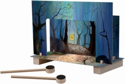 Les figurines se déplacent sur la scène à l'aide de baguettes magnétiques glissées sous le décor – amusant, simple et sans ficelles.