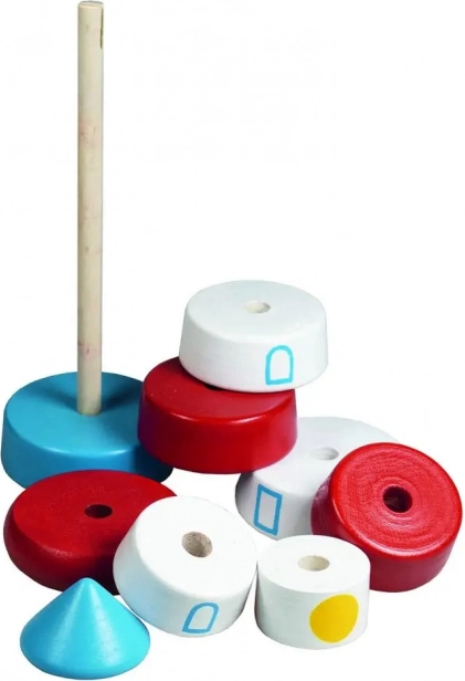 L’empilage sur une tige entraîne la coordination œil–main, le tri par forme et par taille ainsi que la perception des couleurs. Un premier jouet éducatif idéal pour les tout-petits.