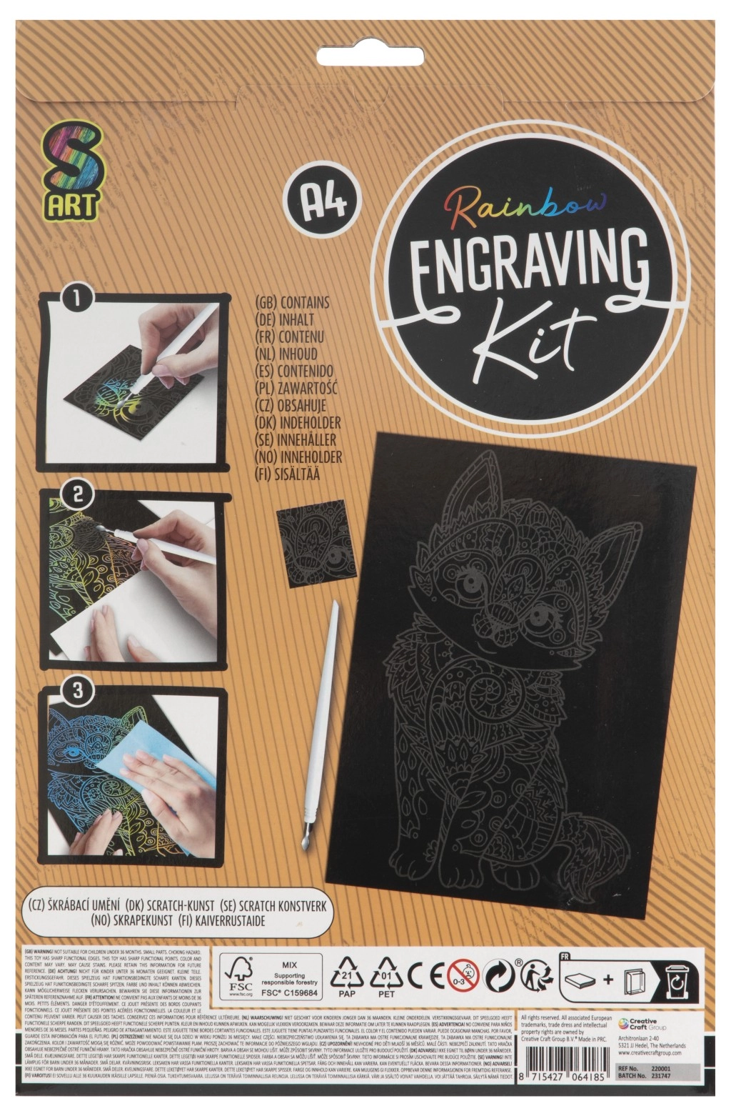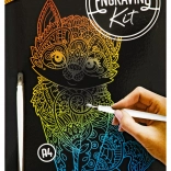 La couche de couverture noire se transforme au grattage en couleurs arc‑en‑ciel vives. Créez un motif de chat détaillé sans peinture ni colle – le stylet fourni suffit.