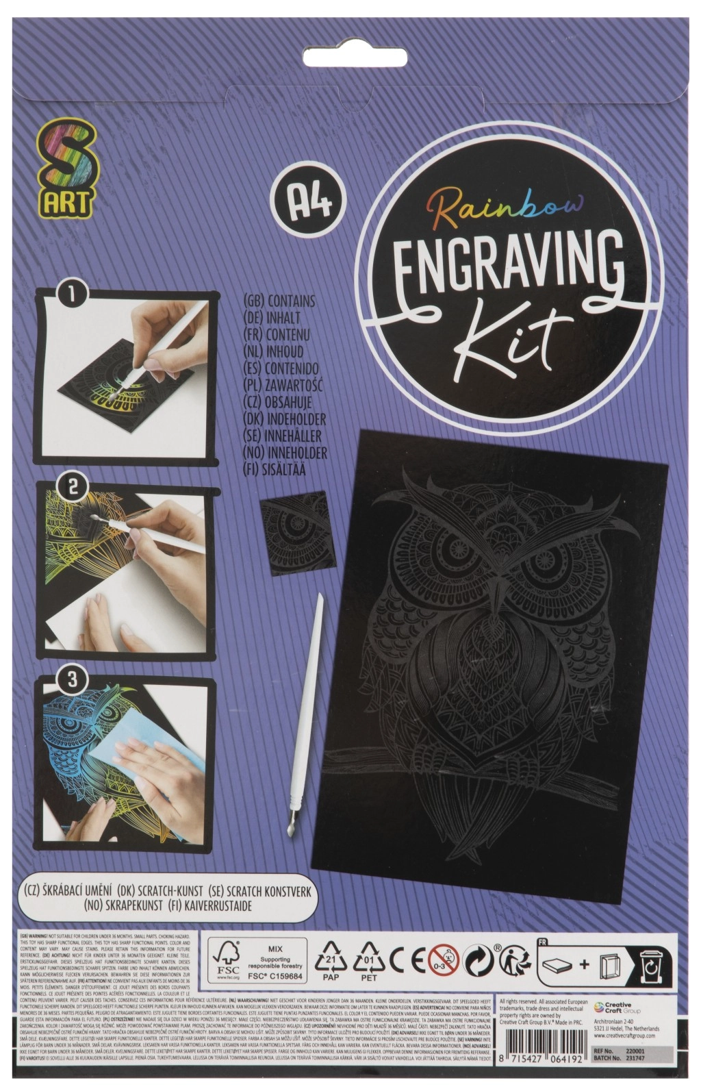 - 1× image avec couche colorée (arc‑en‑ciel), 1× stylet à gratter en plastique avec pointe métallique, 1× image d’essai