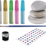 Trois pierres naturelles lisses, un pinceau, de la peinture noire, cinq teintes métalliques et des strass – commencez à créer dès l’ouverture du coffret.