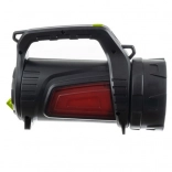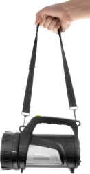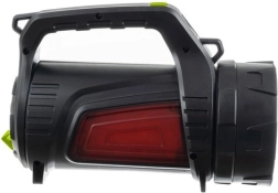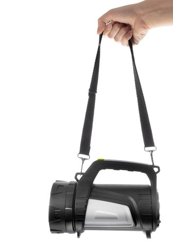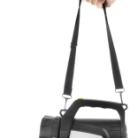 Le panneau latéral fournit une lumière d’avertissement rouge en deux modes (fixe/pulsé), utile en cas d’urgence ou pour signaler une zone. La batterie intégrée 3,7 V / 8000 mAh assure 6–8 heures d’autonomie et sert de powerbank via USB pour recharger un téléphone ou d’autres appareils. Grâce à la poignée confortable et à la bandoulière réglable, le projecteur se porte facilement à la main ou à l’épaule.