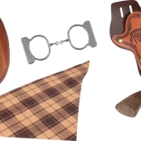 Chapeau, étui pour revolver, foulard, menottes, étoile de shérif, revolver