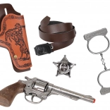 Profitez de l'amusement avec cet ensemble cowboy comprenant un étui en cuir, une ceinture, une étoile de shérif, des menottes et un revolver richement gravé.