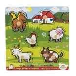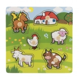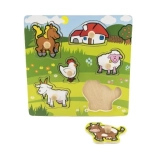 Ce puzzle comprend au total 5 animaux colorés, notamment un cheval, une chèvre, un mouton, une poule et une vache, qui sont faciles à saisir grâce aux petites poignées en bois. Chaque pièce a sa place sur le plateau en bois, ce qui aide également les enfants à apprendre à placer correctement chaque pièce.