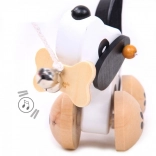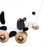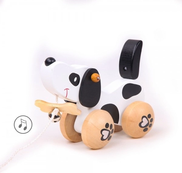 Le chien est sur des roues avec un motif de pattes et sa queue se remue en mouvement, ce qui ajoute à son côté ludique. Le plaisir est renforcé par une clochette qui stimule la perception auditive des enfants. Il est équipé d'une ficelle reliée à un os dans sa bouche, ce qui permet une traction facile. Le jouet est adapté pour jouer, tant à l'intérieur qu'à l'extérieur.