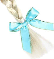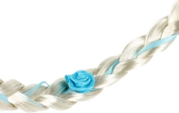 Une élégante tresse blonde, entrelacée d’un ruban bleu clair et de petites fleurs, apporte douceur et une touche féerique au costume.