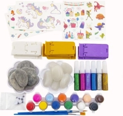 Découvrez la magie de la peinture sur pierres avec un kit créatif qui ravira enfants et adultes. Le coffret contient tout le nécessaire pour créer des décorations originales – des pierres aux peintures et pinceaux. Il inclut également des pierres qui brillent dans le noir, pour que vos créations resplendissent même après la tombée de la nuit. Une activité idéale pour développer la motricité fine, la créativité et l’imagination.