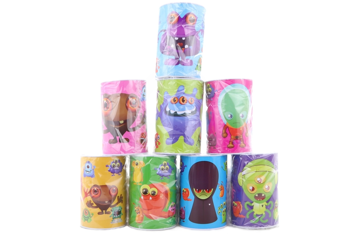 Tirelire en tôle avec motif de monstres d’environ 15 × 10 cm. Emballée dans un sachet. La tirelire ne s’ouvre pas. Âge 3+.