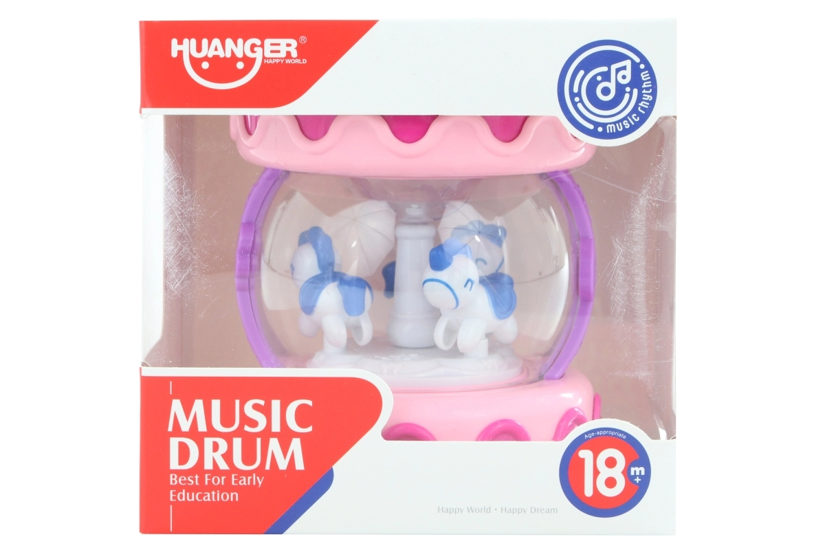 Amusant tambour rose pour enfants aux fonctions variées qui développent le sens du rythme et les sens. Il joue des mélodies, émet des sons d’animaux, s’illumine et des petits chevaux tournent à l’intérieur. Inclut un contrôle du volume et un fonctionnement sécurisé avec 3× piles AAA.