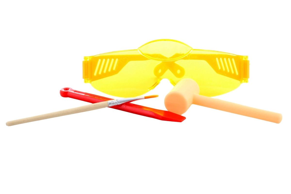 - Bloc à gratter avec os, burin, pinceau, marteau, lunettes de protection, loupe