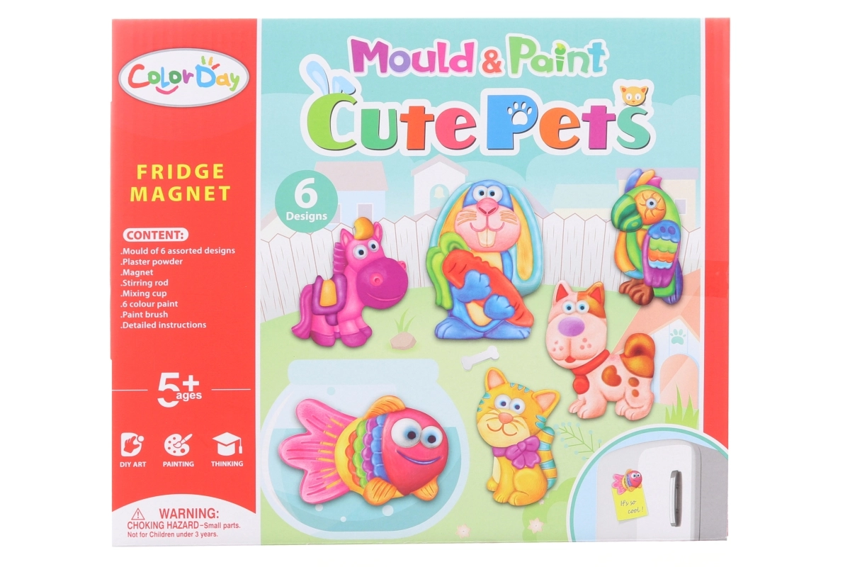 - Set complet : plâtre, bol en plastique, moule en plastique avec 6 motifs, 6 peintures, pinceau, aimants, notice