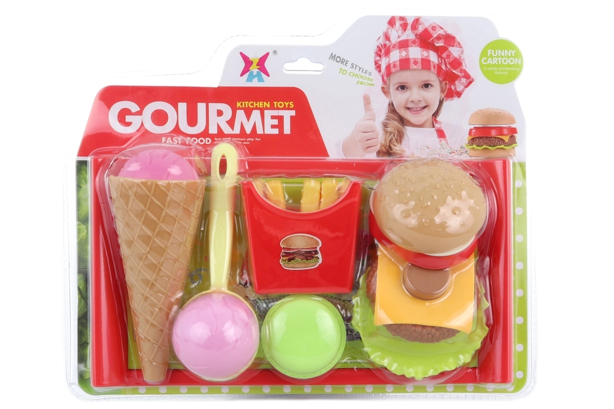 Ensemble ludique de nourriture en plastique pour enfants avec plateau, idéal pour jouer à la cuisine ou au restaurant. Comprend une glace en cornet, une boule de glace avec cuillère à glace, une macaron, des frites et un hamburger démontable en ingrédients individuels. Idéal pour le développement de l’imagination, de la motricité fine et du jeu en groupe.