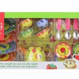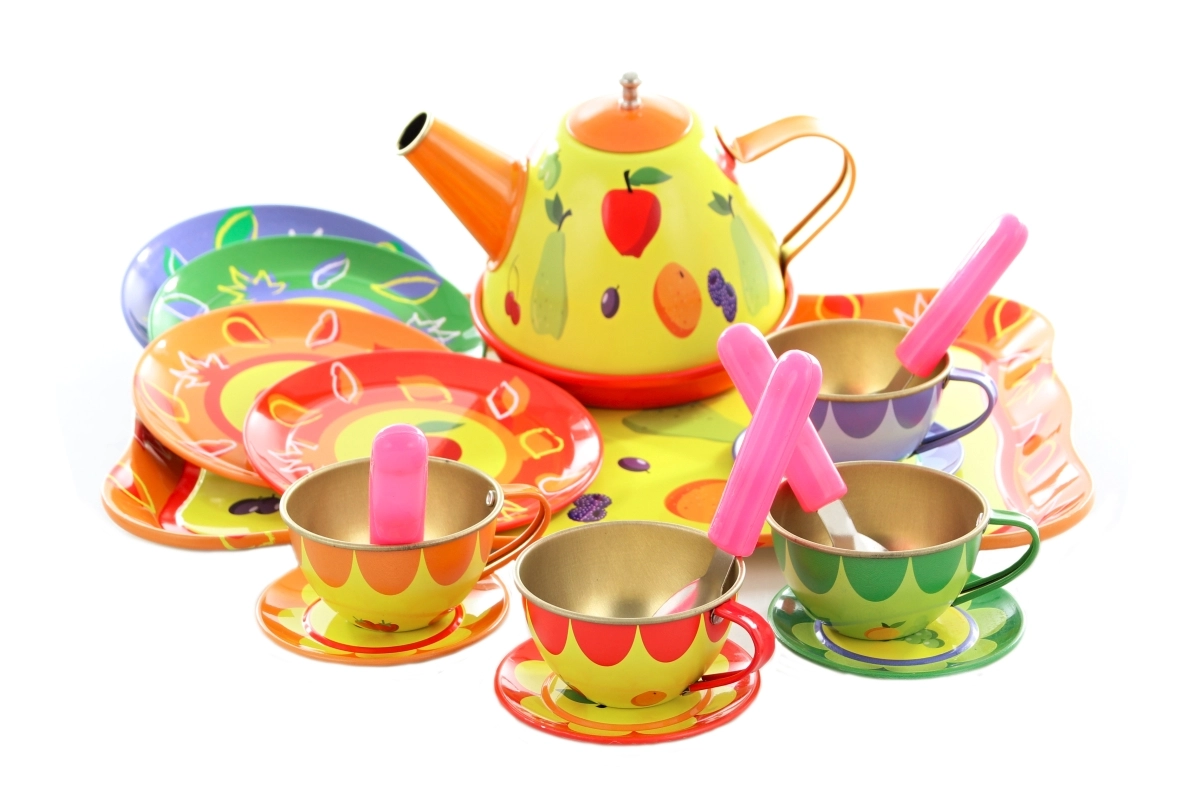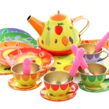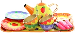 Illuminez l’après-midi des enfants avec ce service à thé coloré en métal pour petits hôtes. Le set comprend une théière, un plateau, des tasses, des soucoupes, des assiettes et des cuillères – le tout avec de joyeux motifs fruités et floraux. La fabrication robuste en métal est idéale pour jouer au goûter, et encourage l’imagination, le jeu de rôle et l’interaction sociale. Convient aux enfants à partir de 3 ans.