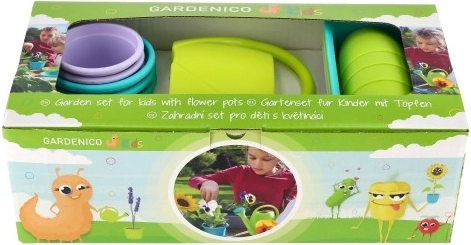 Le grand ensemble de jardin Gardenico Kids est idéal pour les petits jardiniers. Il contient tout le nécessaire pour cultiver des herbes et d'autres plantes, y compris des outils pour enfants, un ensemble de mini-bac, des pots de fleurs et des soucoupes.
