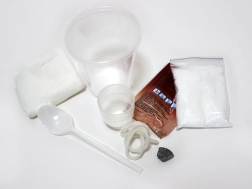 phosphate dihydrogéné d’ammonium, colorant alimentaire vert, bécher, 2 gobelets en plastique, cuillère en plastique, fil de laine, mouchoir en papier, petite pierre, mode d’emploi en tchèque